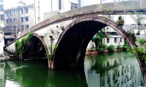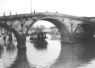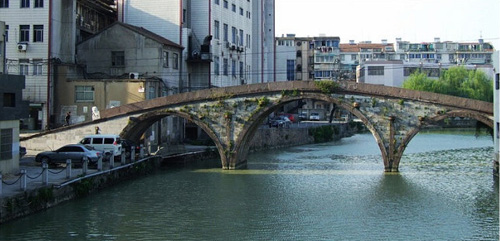 “桥里桥”的故事,“潮音桥是明嘉靖十八年建造的,在此之前那里是个渡口,名叫潮音渡,而‘潮音’之称取义于舟山普陀潮音洞。桥名‘潮音’的由来是因东苕溪之水浩瀚而来,至南郊碧浪湖为之一蓄,而后穿城南而进,水急时如潮有声,从而得名。潮音桥曾几经修筑,最后一次修于清嘉庆年间。桥长54.2米,跨度29米,宽5米。净高5.63米。桥两端原都雕有白石卧狮,桥上石板缝中生有枸杞、石榴等。”